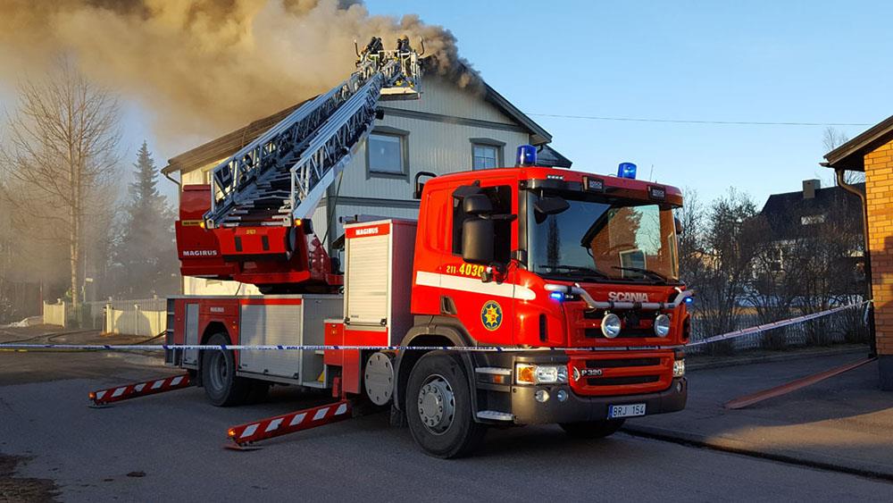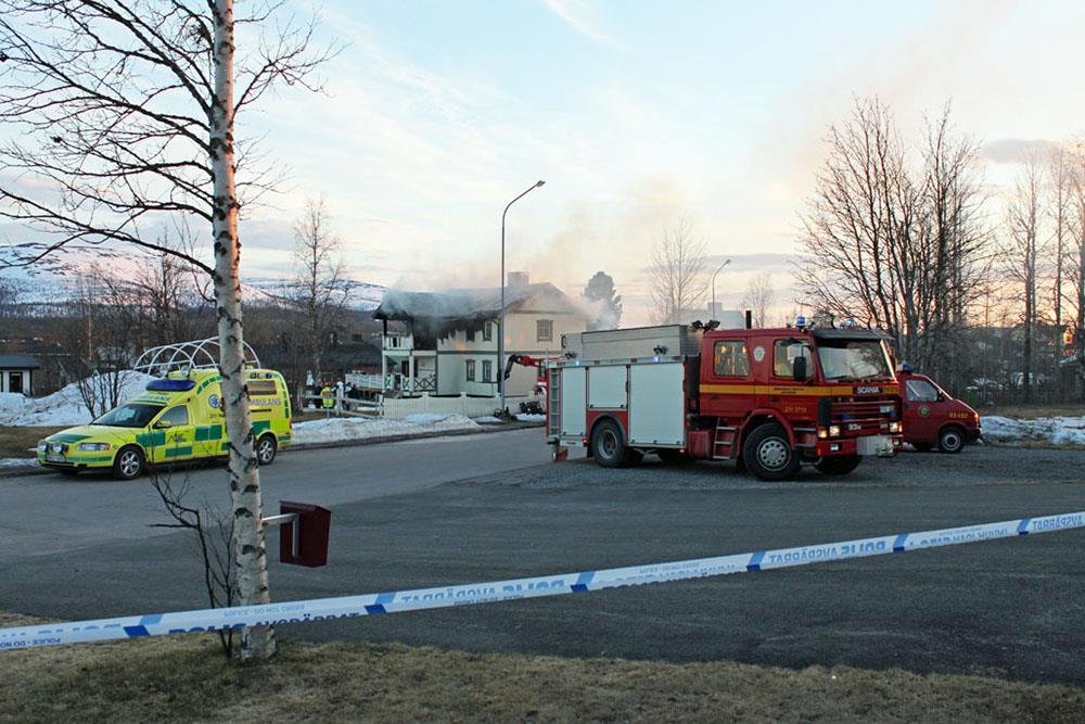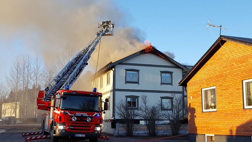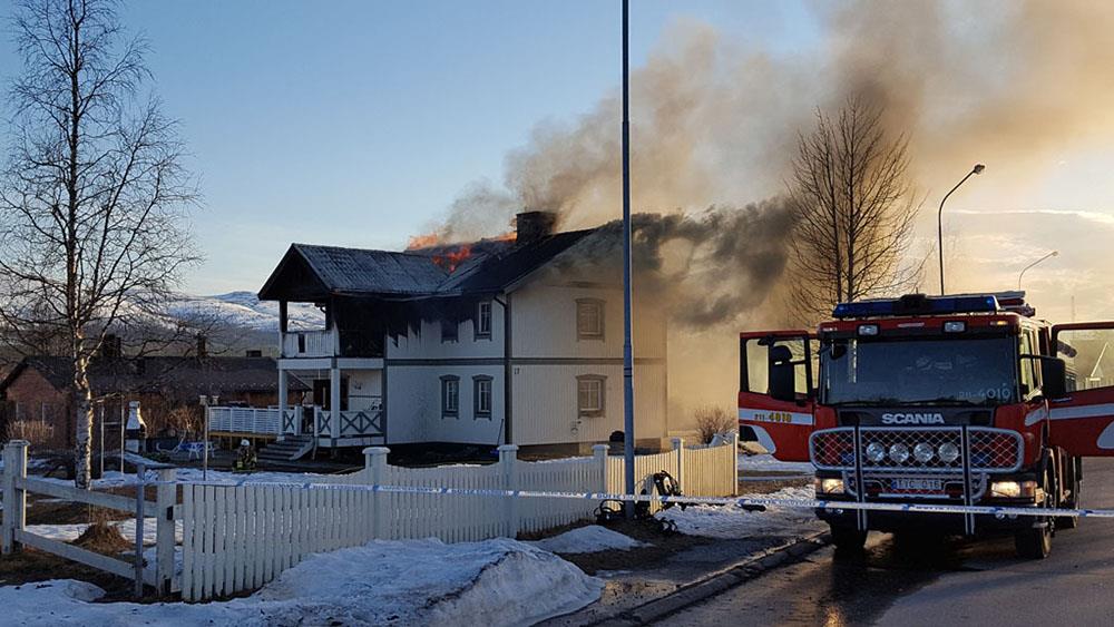 Räddningstjänst, polis och ambulans larmades till branden. Vid 20- tiden på lördagskvällen brann det med öppna lågor från taket. När räddningstjänsten anlände till platsen brann det kraftigt på övervåningen.