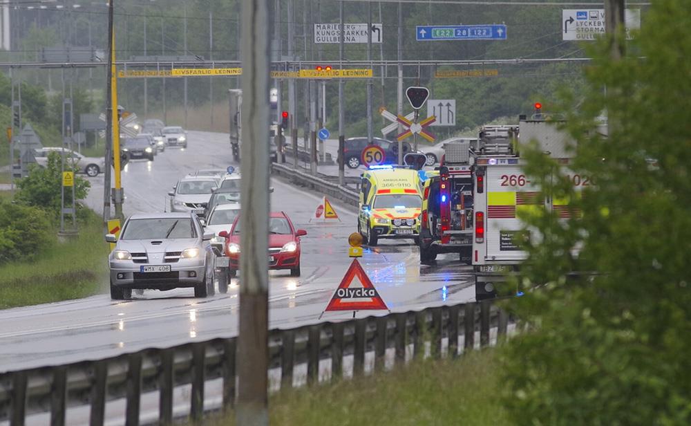 KARLSKRONA-BLEKINGEPå söndagseftermiddag larmades räddningstjänsten till riksväg 28 i höjd med gullberna där en bil i troligtvis hög fart kört in i en stolpe som vikt sig över vägen.