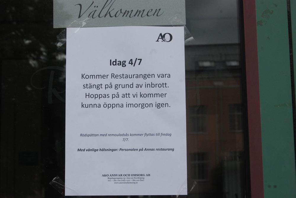 NYKÖPING-SÖRMLANDAnnas restaurang i Nyköping tvingades att hålla stängt på tisdagen.