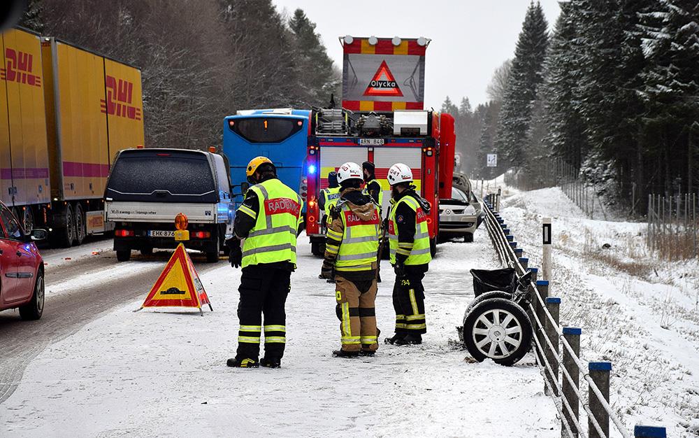 När första räddningsstyrkan från Skövde kommer fram till platsen är samtliga inblandade ute ur sina bilar och ingen person kom till skada vid olyckan.