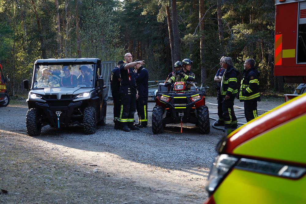Terrängen är oländig och brandmännen har behövt dra slang flera hundra meter ut i skogen från där brandbilarna står parkerade.
