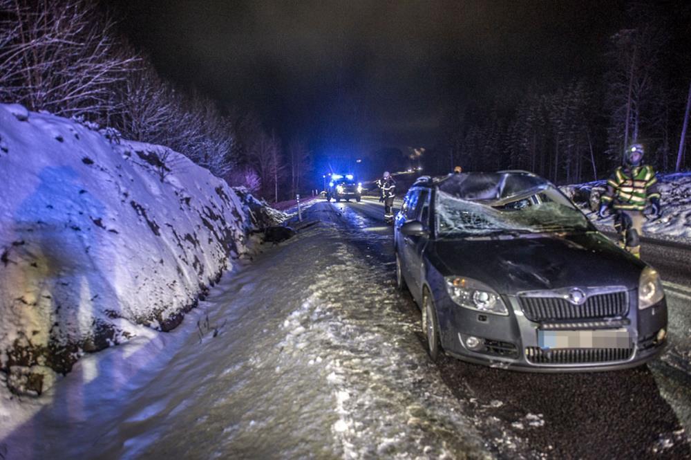 Räddningstjänst, polis och ambulans larmades till platsen. Älgen dog och en person fick föras till sjukhus med oklara skador.