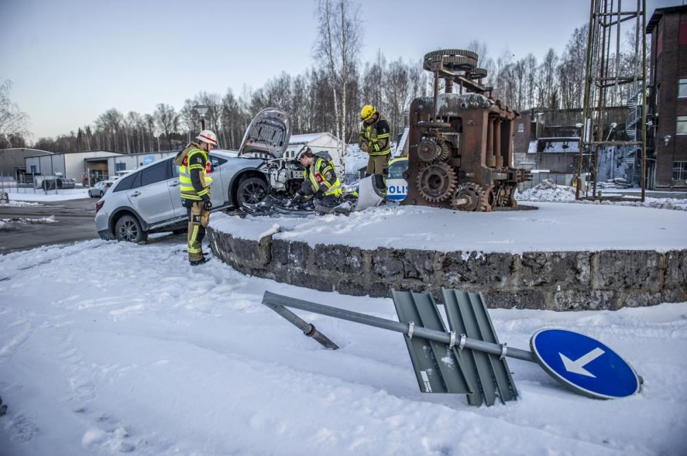 På måndagskvällen körde en bil i hög hastighet rakt in i en rondell med en konstruktion av murar och skulpturer i Koppardalen.