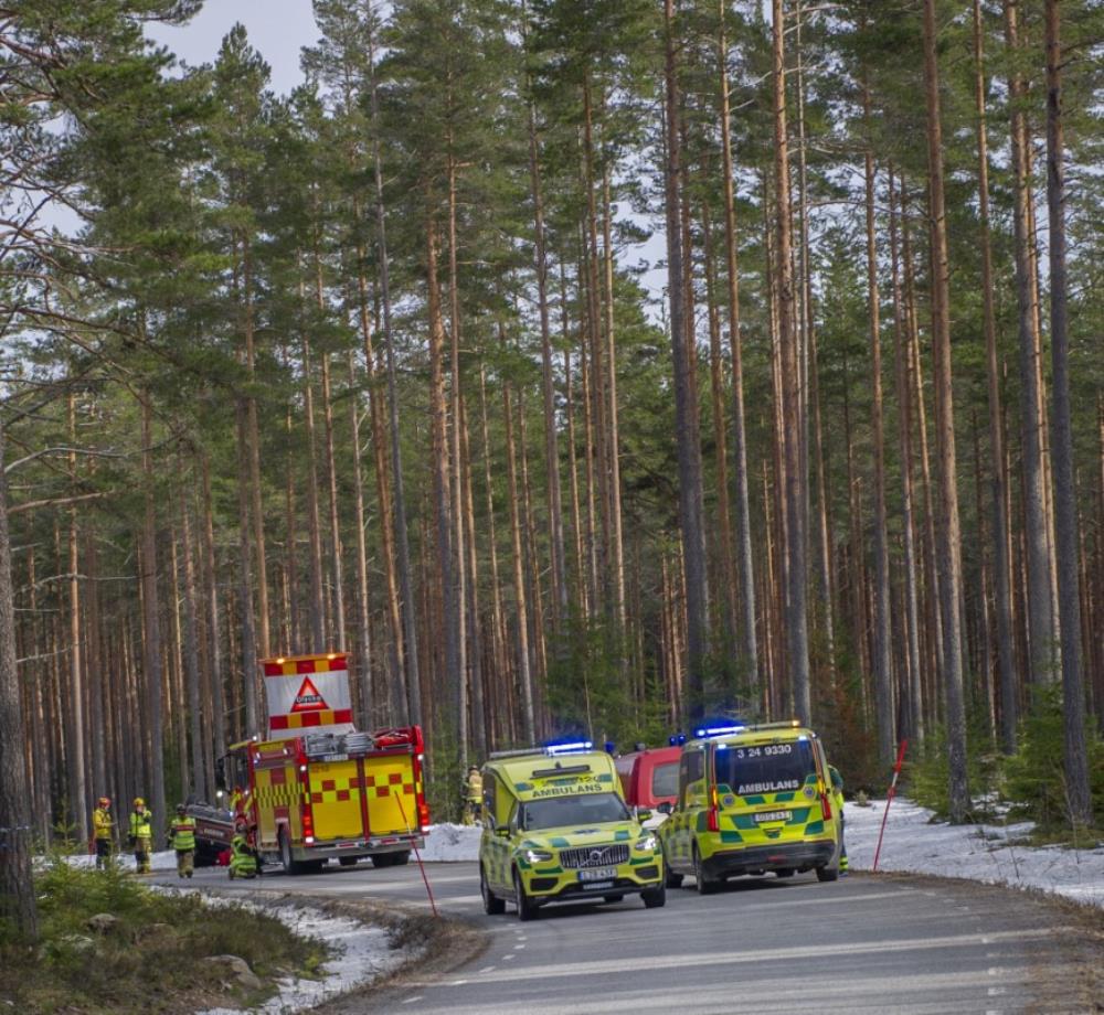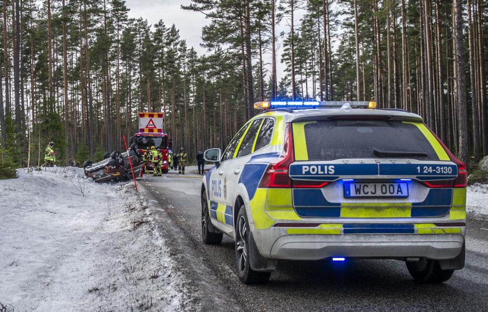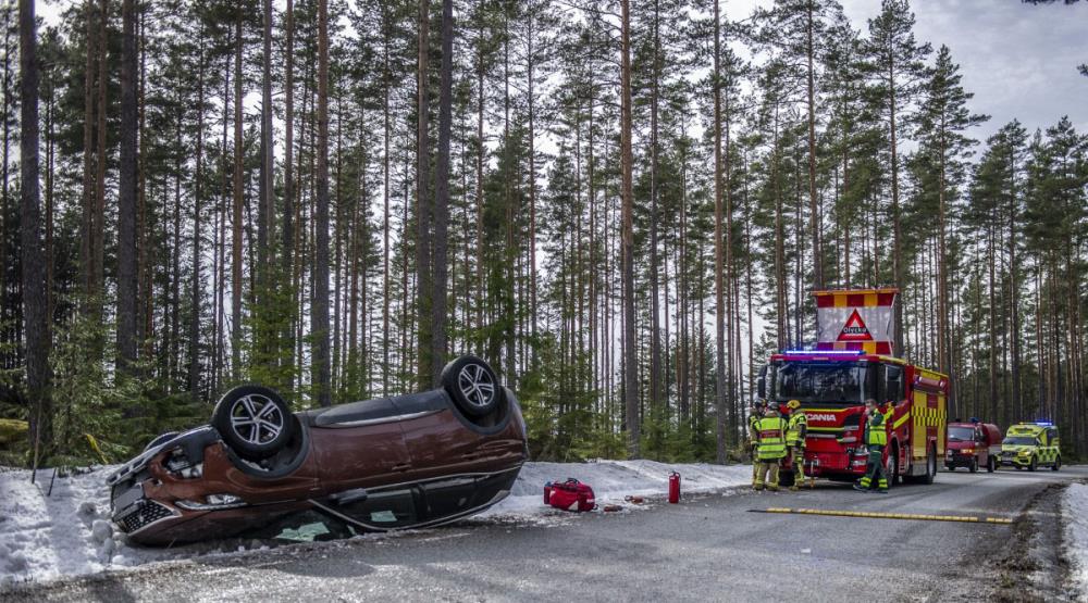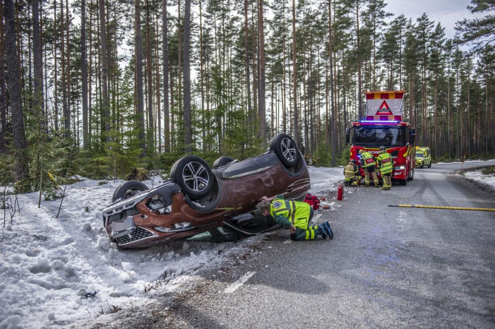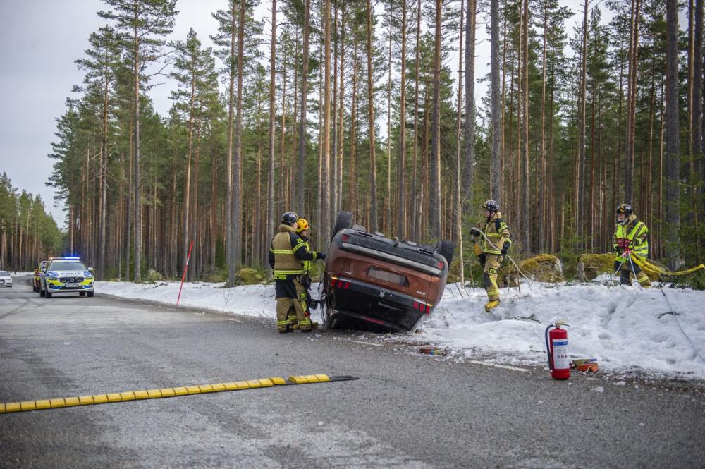 Räddningstjänst, polis och ambulans larmades till platsen. Efter olyckan hamnade bilen på taket.