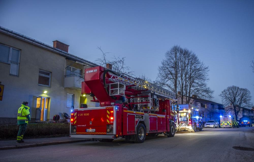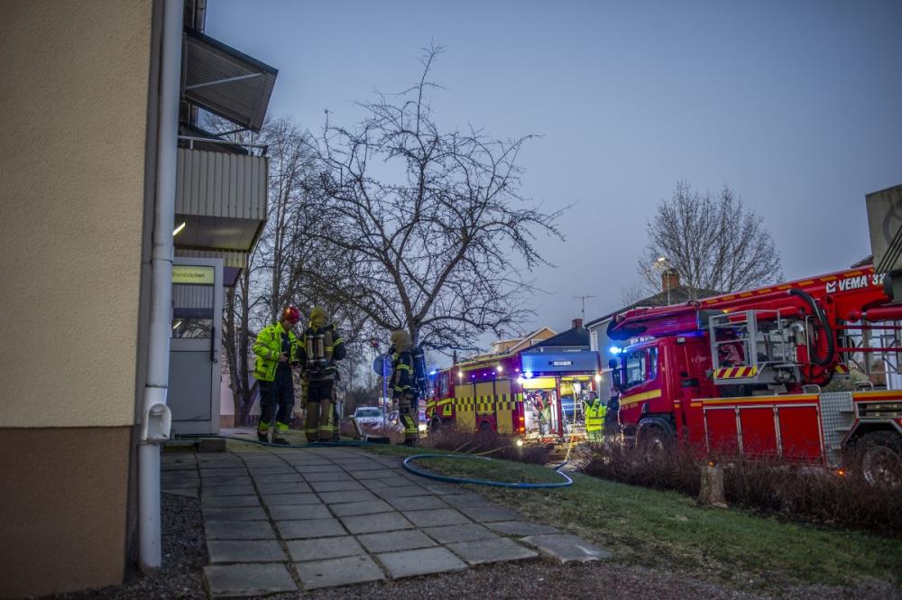 Räddningstjänst, ambulans och polis larmades till en brand i ett flerfamiljshus klockan 03.54. När första styrkan kom fram brann det i en lägenhet på adressen.