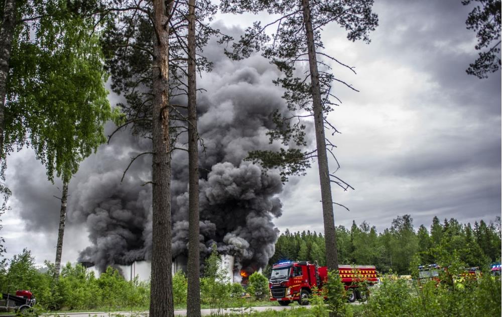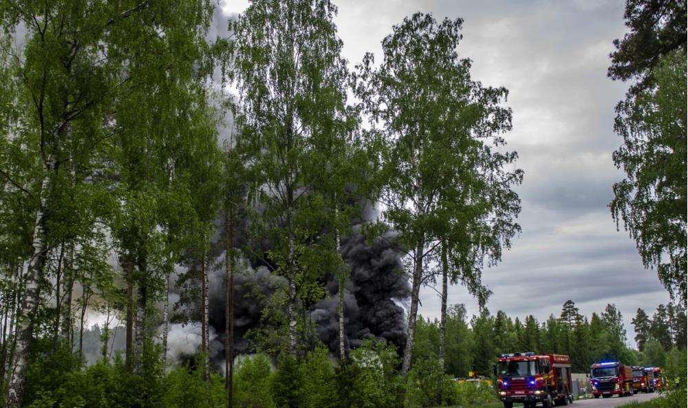 En kraftig brand utbröt i en industribyggnad i Hedemora under fredagen, med hörbara explosioner och en avspärrad väg i närheten.
