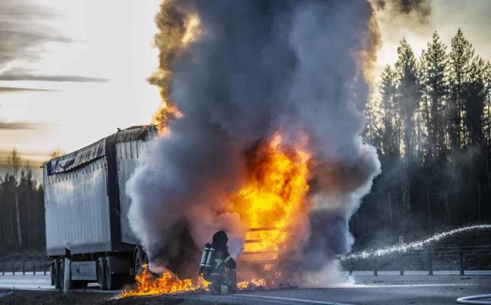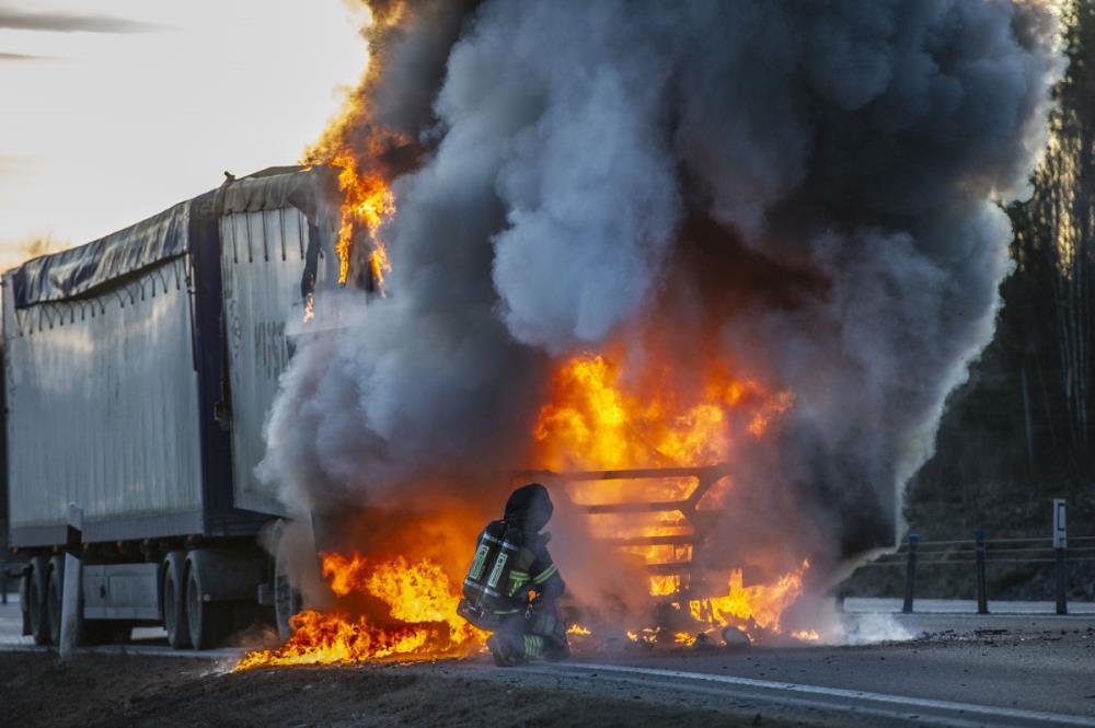 En lastbil började brinna på riksväg 68 mellan Norberg och Avesta under måndagskvällen.