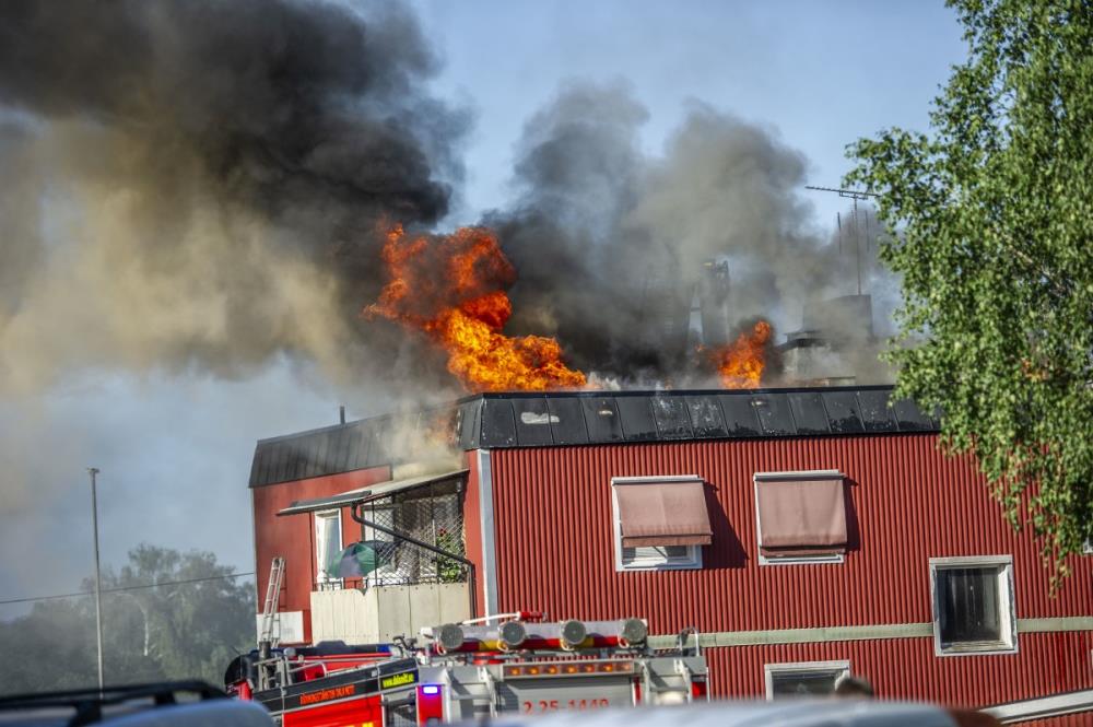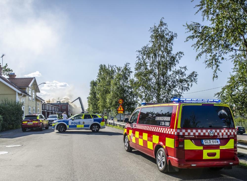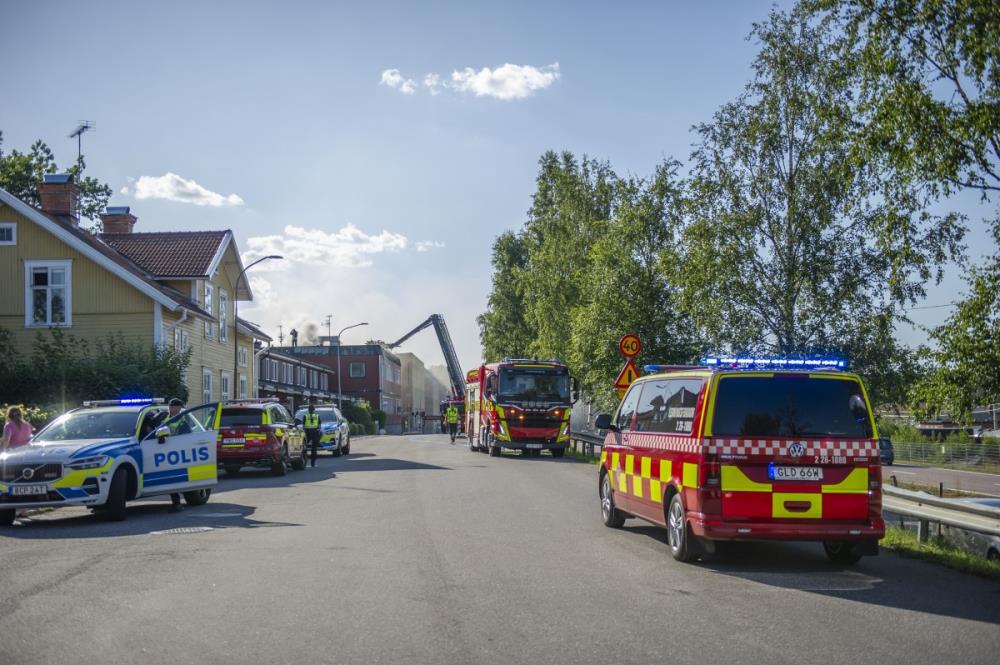 – Branden är inte under kontroll. Det finns risk för spridning både inom fastigheten och till närliggande byggnader, sade Jonas Eriksson, larm- och ledningsbefäl vid Räddningssamverkan.
