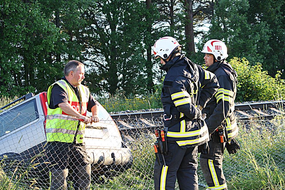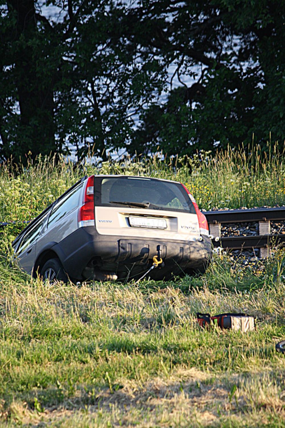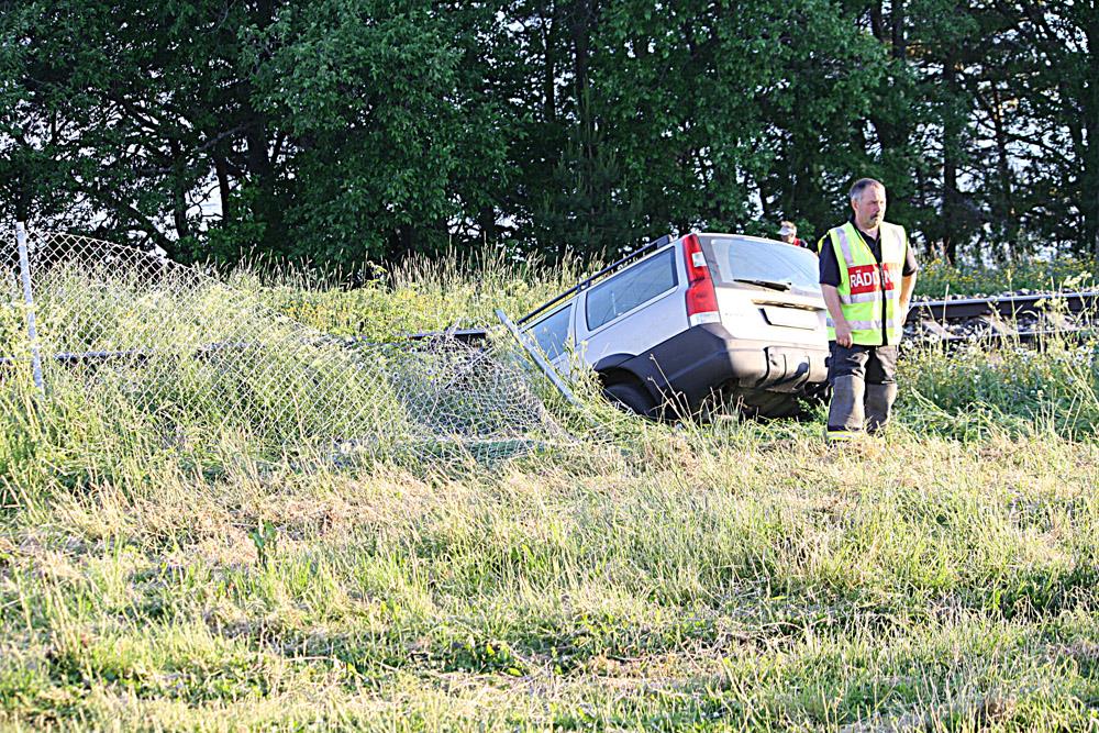 En personbil hade av okänd anledning kört genom järnvägsgrinden och ner i diket bredvid järnvägsspåret.