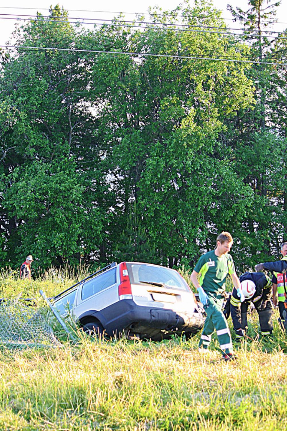Föraren skall ha tagit sig ut ur bilen själv efter olyckan men fick föras med ambulans till sjukhus för kontroll.