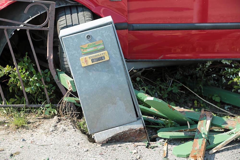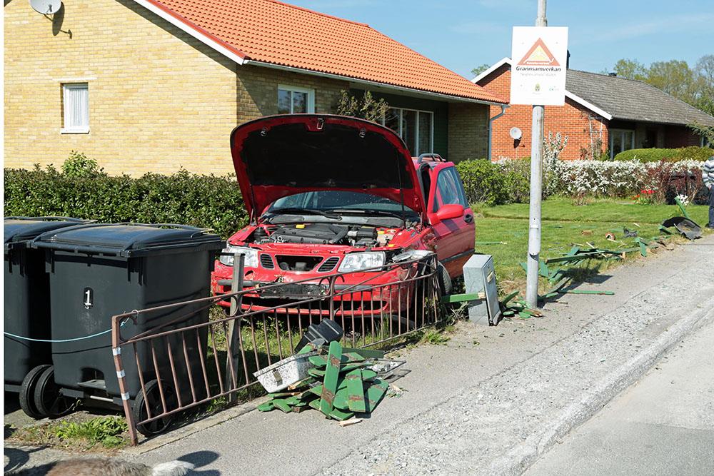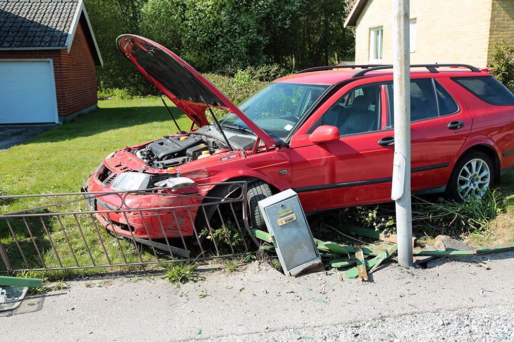 En personbil körde av vägen, in i ett elskåp och sedan genom ett staket vid en villa. Räddningstjänst, polis och ambulans larmades till platsen.