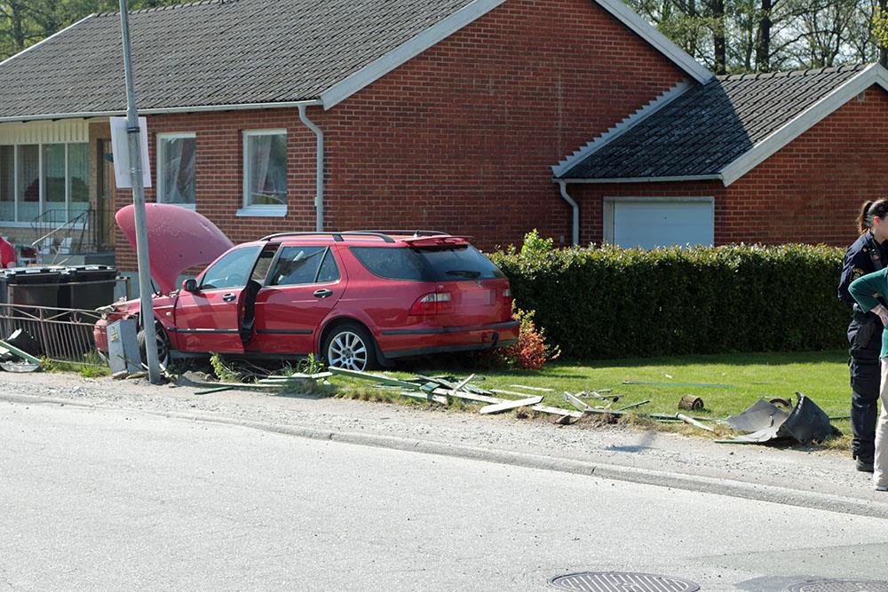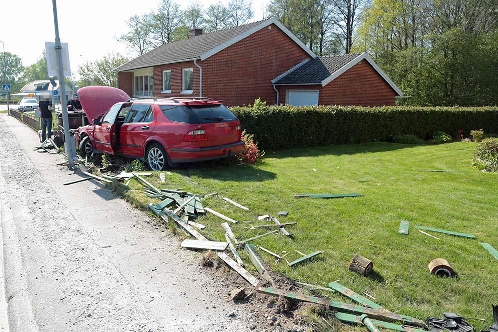 När räddningsstyrkan anlände satt bilföraren och vilade på en stol vid huset. Ambulanspersonalen kontrollerade föraren och plåstrade om denne.