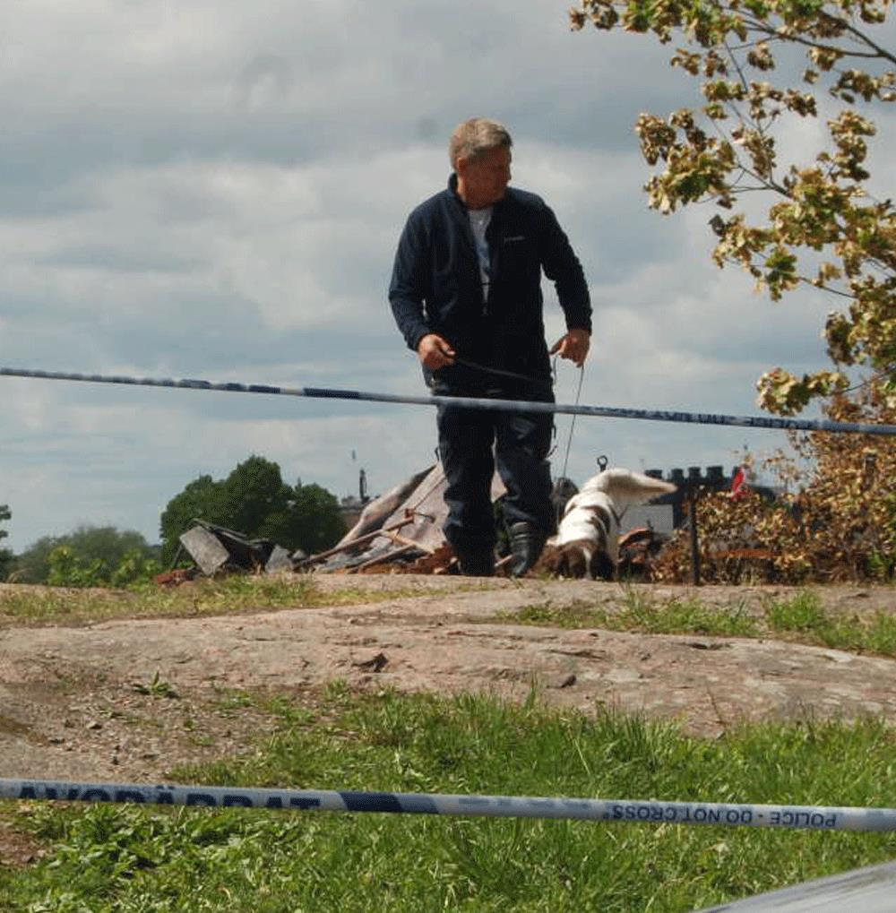 Under måndagen undersöktes platsen bland annat av speciella brandhundar som sökte efter spår av brandfarliga vätskor.
