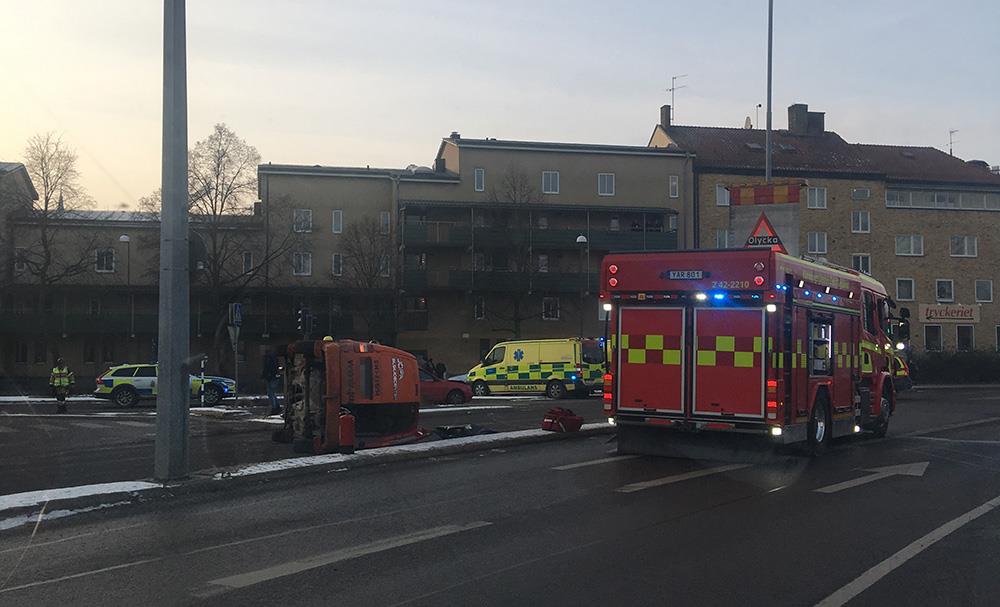 I korsningen Hamngatan/Järnvägsgatan hade två bilar kolliderat. En av bilarna voltade och blev liggande på sidan efter olyckan. Två personer fick medfölja ambulans till sjukhus, oklart med vilka skador.
