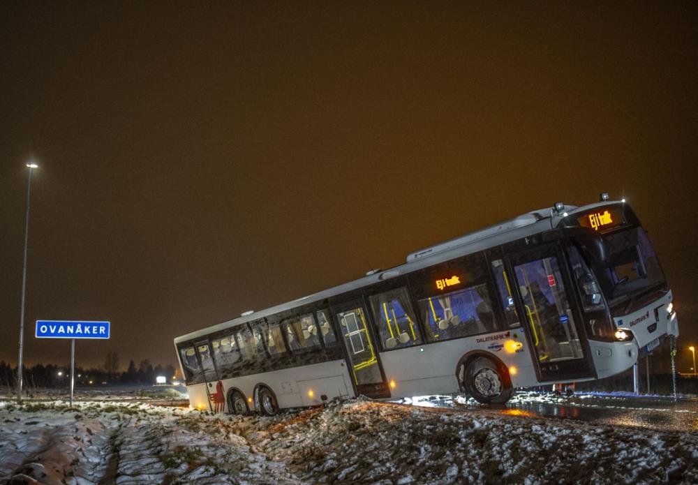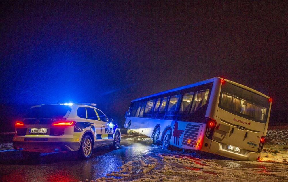 En buss körde av vägen. Tungbärgare fick rycka ut till platsen för att få loss bussen.