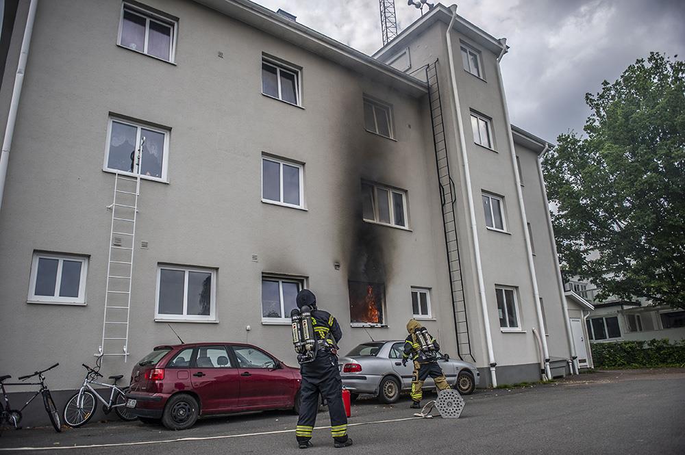 Enligt SOS Alarm ska branden ha startat i ett kök i samband med matlagning, men polisen har inga uppgifter om att nån skulle vara skadad.