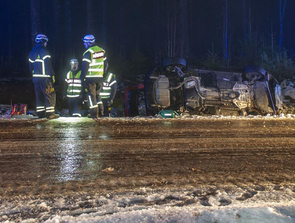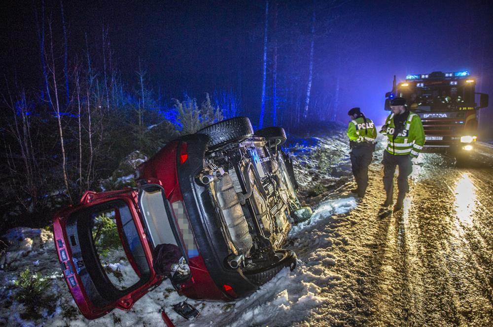 Två personer befann sig i bilen som hamnade på sidan i diket. Enligt uppgifter från fotografen var det mycket halt på olycksplatsen.