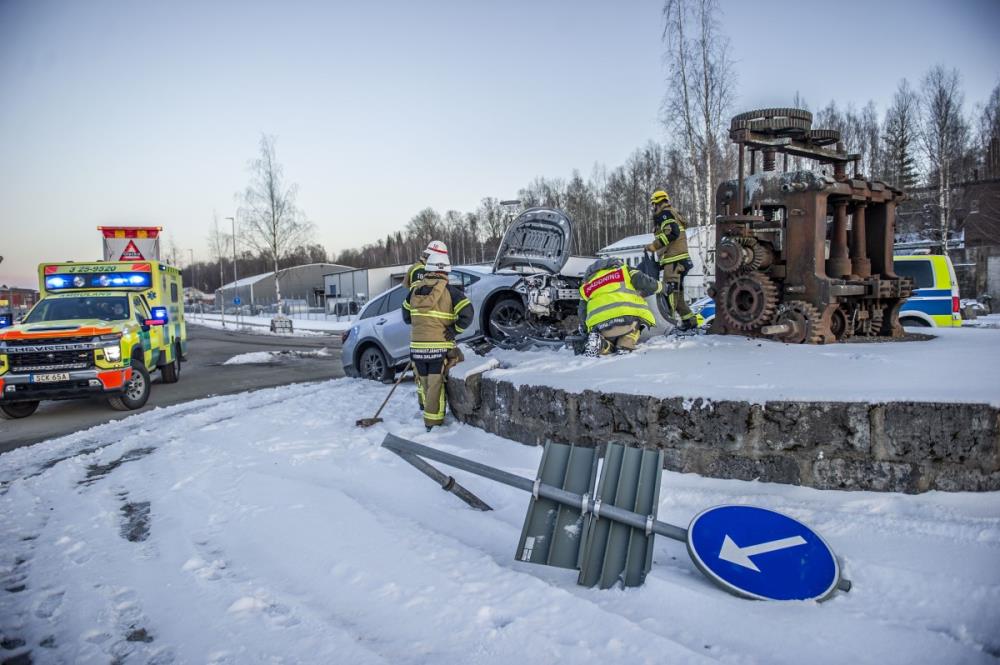 På måndagskvällen körde en bil i hög hastighet rakt in i en rondell med en konstruktion av murar och skulpturer i Koppardalen.