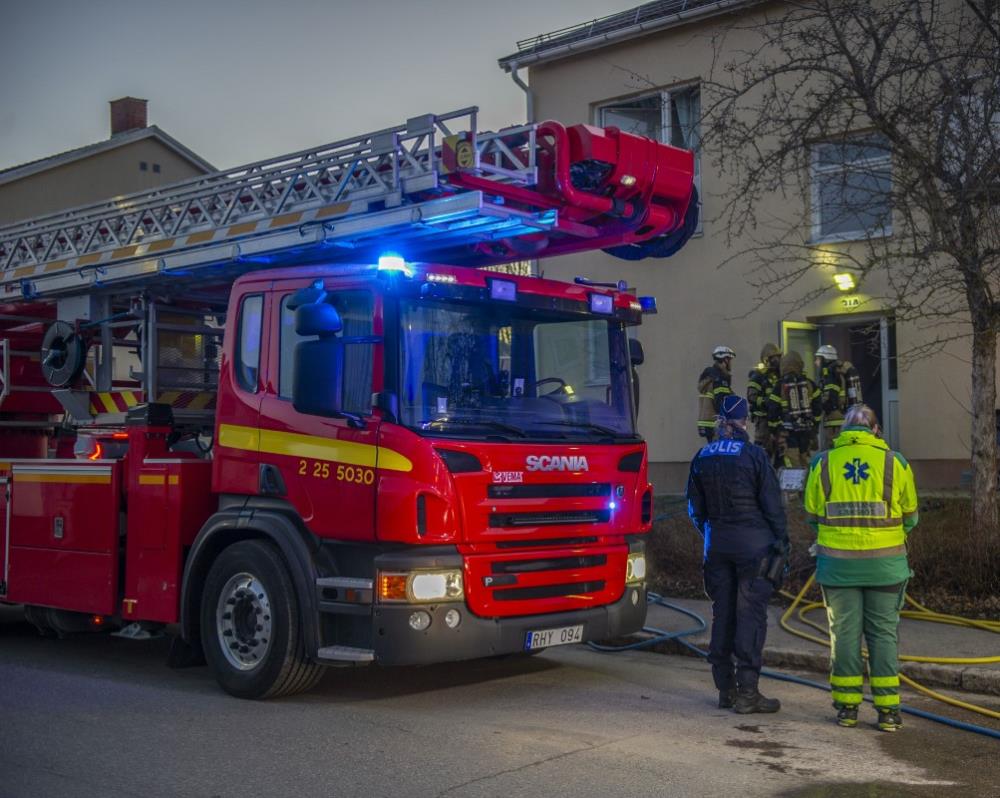 Räddningstjänst, ambulans och polis larmades till en brand i ett flerfamiljshus klockan 03.54. När första styrkan kom fram brann det i en lägenhet på adressen.