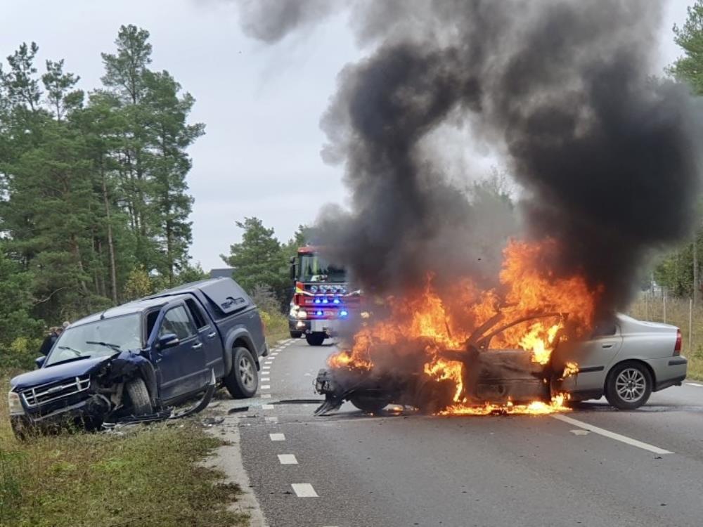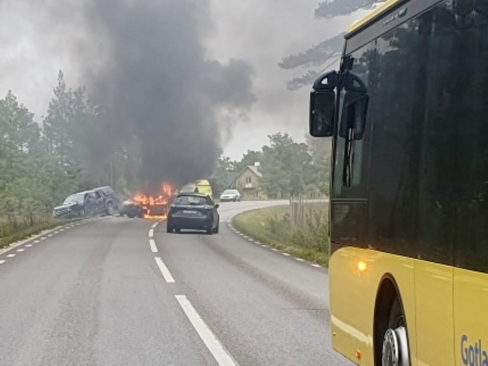 Enligt personen som larmat räddningstjänsten var det två bilar som sammanstött och den ena bilen ska ha fattat eld.