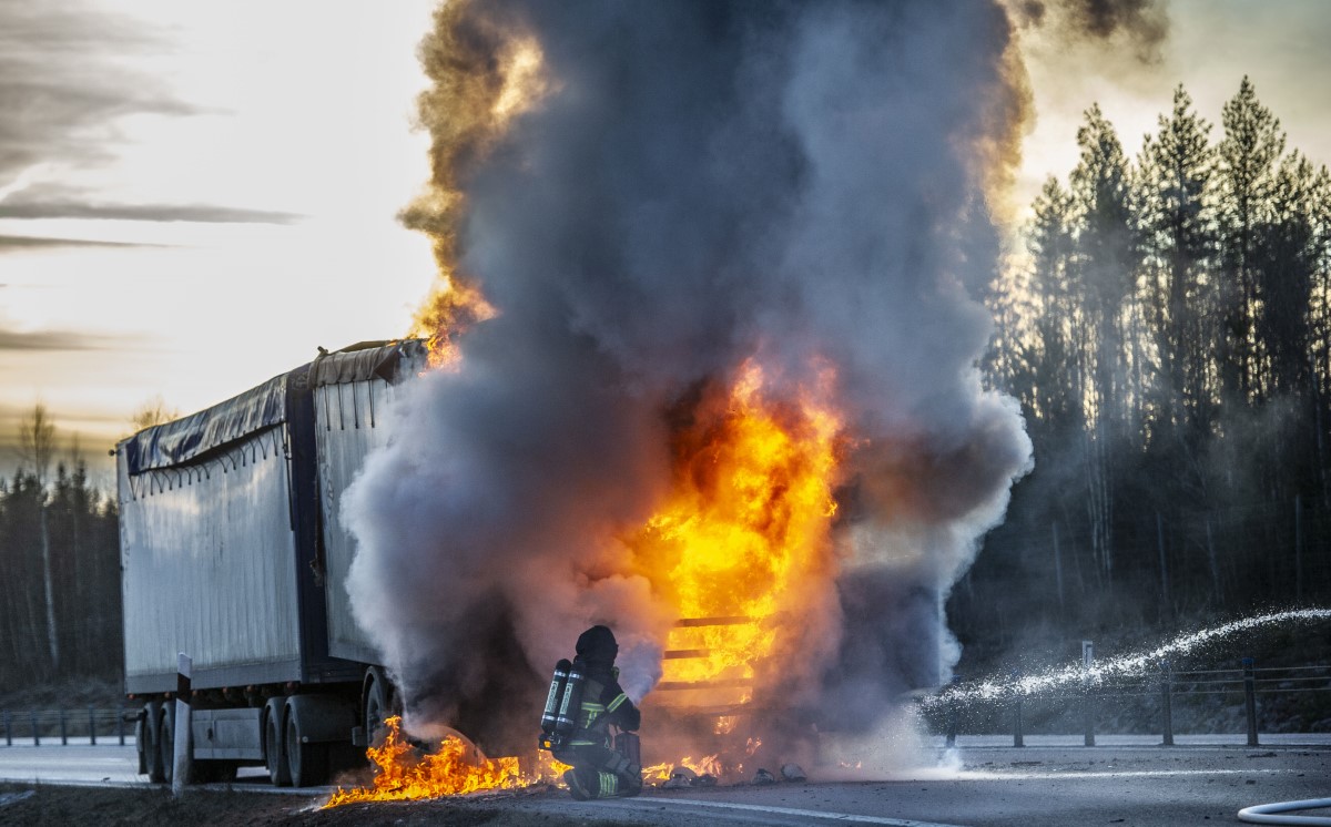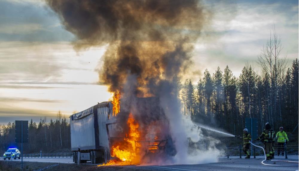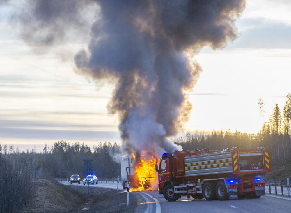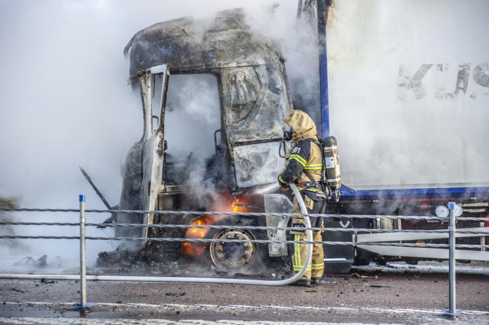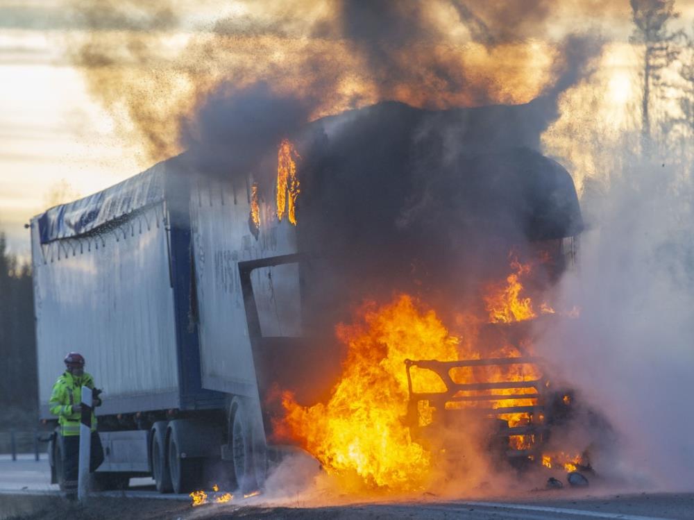 En lastbil började brinna på riksväg 68 mellan Norberg och Avesta under måndagskvällen.