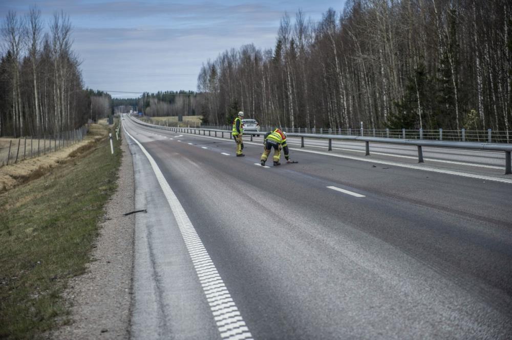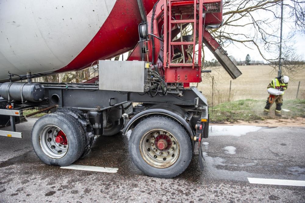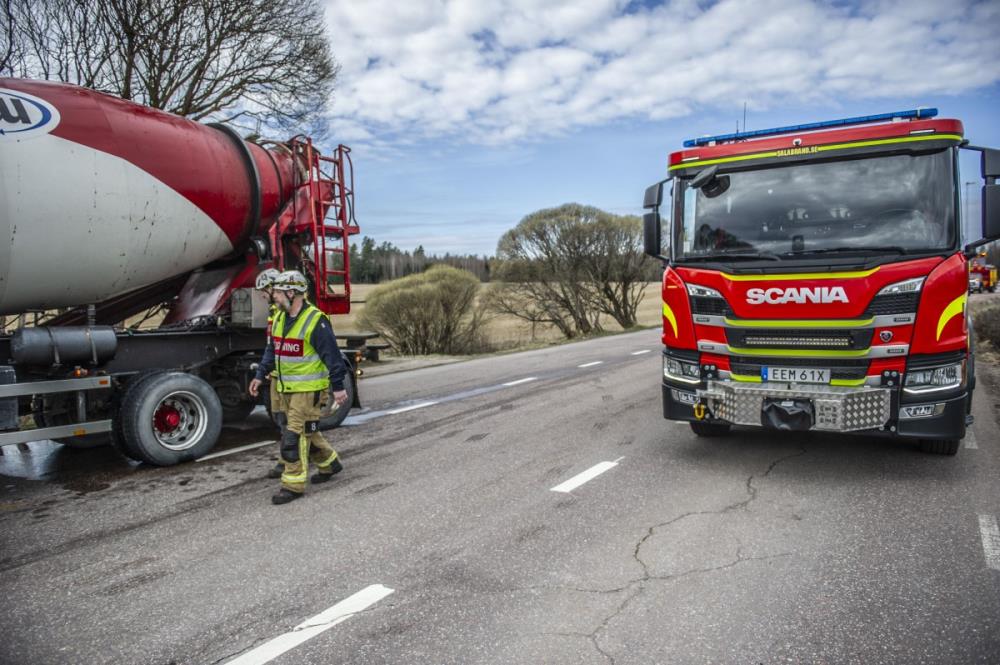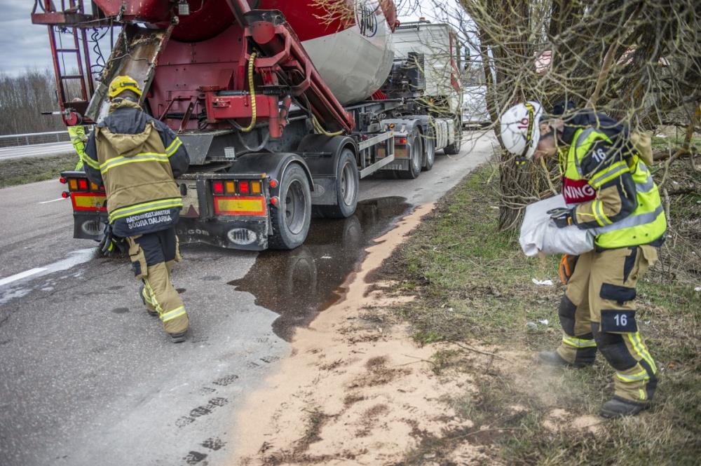 Räddningstjänsten är på plats och arbetar med sanering för att begränsa miljöpåverkan och återställa framkomligheten. Trafikanter uppmanas att ta det försiktigt vid passage och vara uppmärksamma på rådande vägförhållanden.