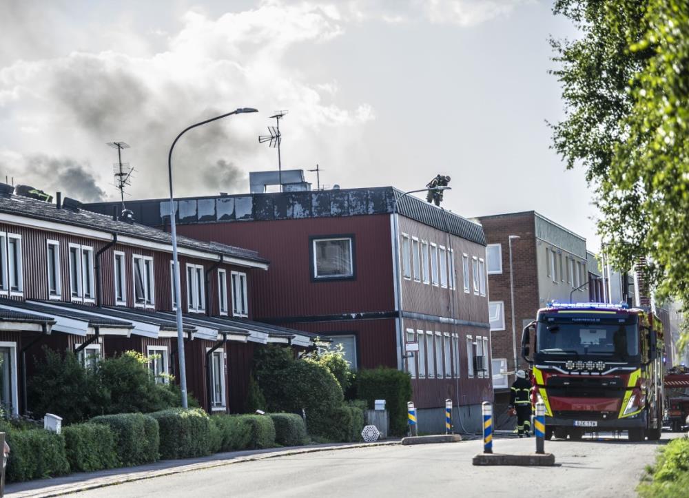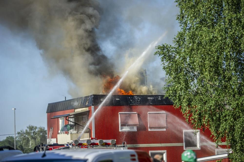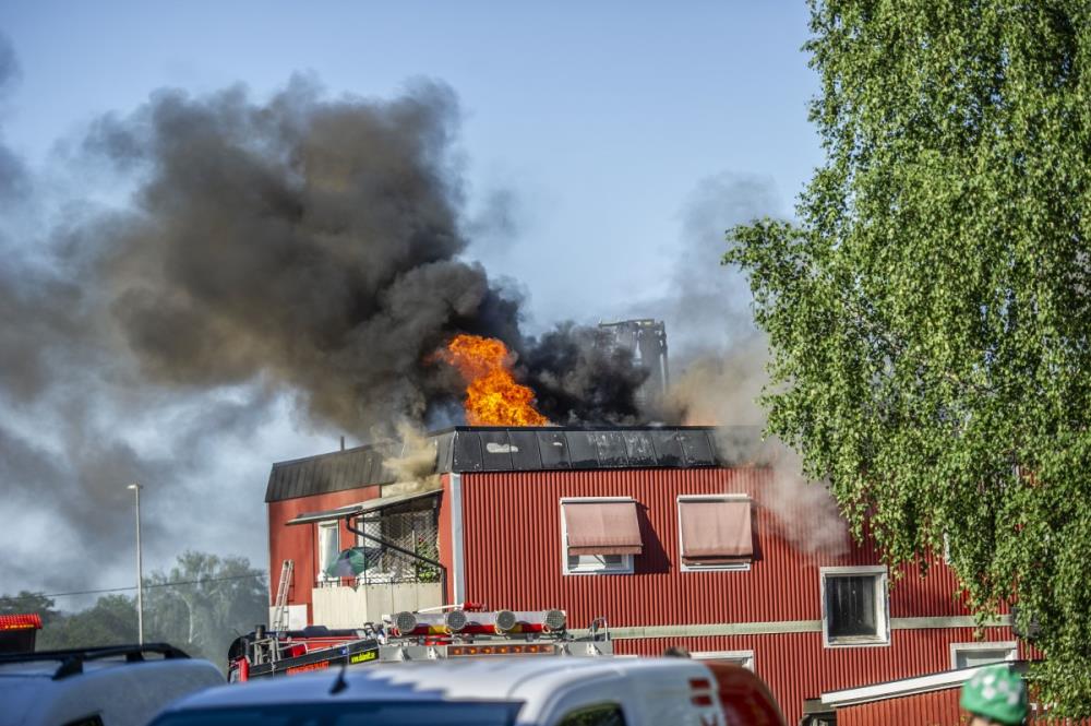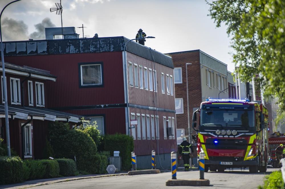 – Branden är inte under kontroll. Det finns risk för spridning både inom fastigheten och till närliggande byggnader, sade Jonas Eriksson, larm- och ledningsbefäl vid Räddningssamverkan.